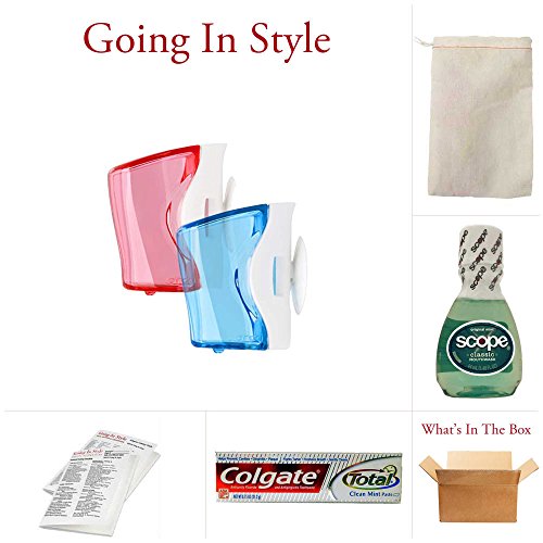 Product Description Travel oral hygiene Going In design Set includes one pack of Flipper toothbrush holders (2 Flippers total), Scope mouthwash and travel size Colgate toothpaste with a handy bag to keep your oral hygiene set all together. Flipper toothbrush holder is a hygienic toothbrush cover for traveling with your toothbrush. The flipper cover automatically snaps open and close . Suction cups on the back of the Flipper toothbrush holder easily adhere to your bathroom mirror or tile so you can store your toothbrush off of the counter. Take your toothbrush with you in your purse, carry on, or backpack and don't worry about it getting dirty.