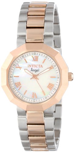 This stunning design from Invicta's Angel Collection features a mother-of-pearl dial and geometric case, which is affixed to a stainless steel and 18k rose gold-plated bracelet.