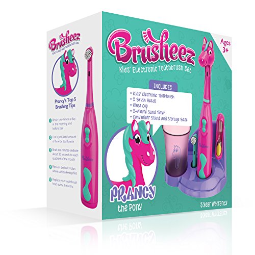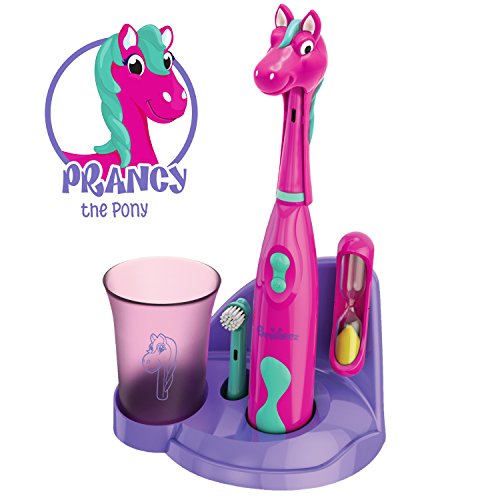 Brusheez - Children's Electric Toothbrush Includes Toothbrush, Adorable Head Cover, 2 Toothbrush Heads, 2-Minute Sand Timer, and Holder Stand - Prancy the Pony