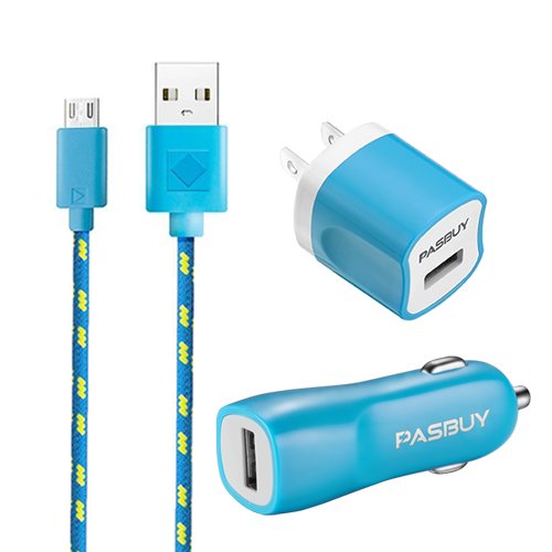 Wellcolor 3 in 1 AC 1A Wall Charger+1A Car Charger+Braided Micro USB Data Sync Charging Cable For Samsung Galaxy S3 S4 S6 S7 Note 2 N4 N5 HTC Motorola LG Sony Android Phones Blue 10Ft