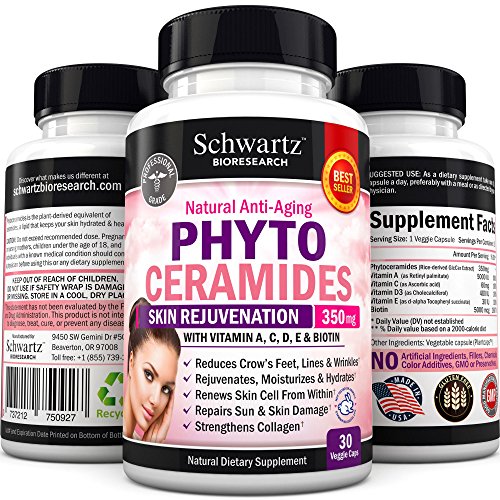 -. Feature : Doctor Formulated Effective Anti-Aging Formula: Our Phytoceramides is the best on the market. Our Phytoceramides 350 mg Supplement reduces fine lines, eliminates wrinkles and crow's feet and promotes smooth, supple skin in less than 3 weeks. Our Phytoceramides 350 mg plant derived is fortified with Vitamins A, C, D, and E for powerful results designed to work. / 100% Safe and Natural Proven Ingredients: Schwartz Bioresearch is a leading brand in 100% natural, professional grade dietary supplements. Proudly manufactured in the USA, with strict adherence to Good Manufacturing Practices (GMP). All batches are 3rd party tested to guarantee the purity and quality of the ingredients with no fillers, no binders and no artificial ingredients. Dermatologist approved. / Customers Say our Superior Phytoceramides are Great for: Hair Growth, Skin Restoration, Skin Rejuvenation, Dry Skin, Shiny Silky Hair, Anti-Aging, Reduction of Facial Wrinkles, Fast Hair Growth, Increased Collagen Production, Improve Skin Tone, Reducing Fine Lines, Wrinkles and Crow's Feet, Reversing Sun Damage, Strong Healthy Nails, Fading Sun Spots, Dark Circles, Saving Money On Expensive Moisturizers / Excellent Results in About 2 Weeks: No more dark circles, no more old age spots, just naturally radiant skin- fast. Get the skin care Japanese women have with Schwartz Bioresearch Natural Anti-aging phytoceramides. Better than Ceramide-PCD 40 mg our skin hair nails all-natural formula makes it possible. As seen in Dr. Oz, this vitamins for hair growth are going to hydrate and moisturize your skin. / Long Lasting Results from the Inside Out: With phytoceramides 350 mg you will start seeing results within the first 20 days. This hair skin nails supplement has phytoceramides plus biotin 5000 mcg and is gluten free.