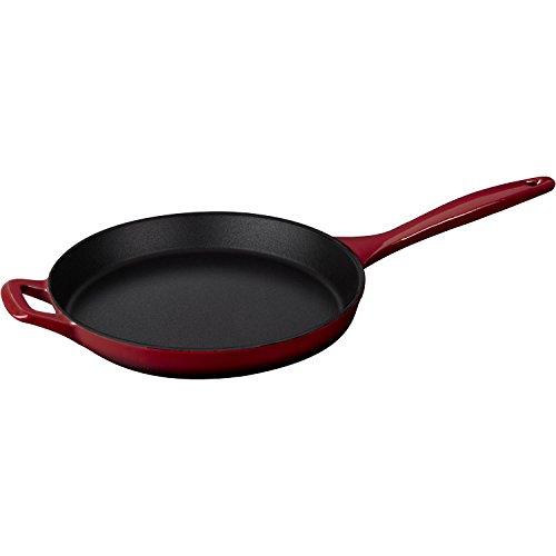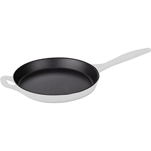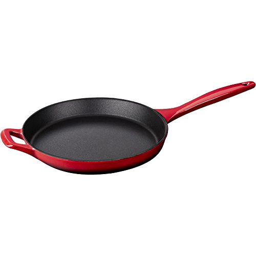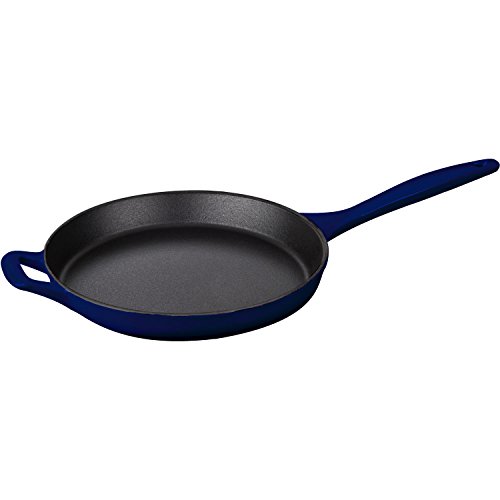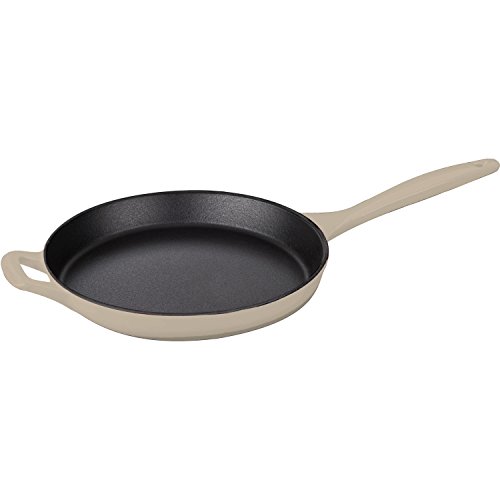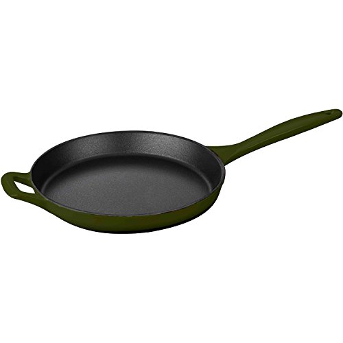 La Cuisine's LC 7550 Round 10 In. Cast Iron Skillet, in green, is ideal for Spanish omelettes, pancakes, oven baked apple pies and also for searing meat to retain moisture and lock in flavor. The large radius corner inside this skillet is for ease of use and to help prevent food corner traps. The integrated cast iron handle plus distinctive easy-grip helper-handle disperses the weight of the pan and makes it suitable for both stove and oven use. La Cuisine's cast iron cookware is crafted using sand molds, which are used only once, forging a lighter product with a very fine enamel finish that is truly unique. Wonderfully versatile, La Cuisine's round fry pans are suited to all stovetops, including induction. The non-toxic, matte black enamel interior surface is scratch-resistant, stain-resistant, gives excellent food release that improves through continued use, and is simple to clean - just wash in warm water.Feature