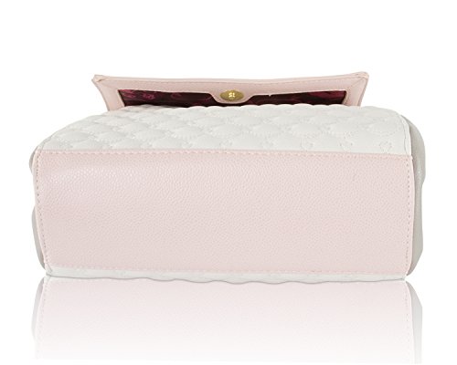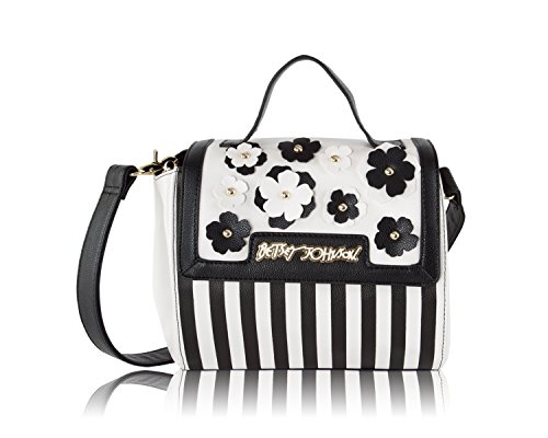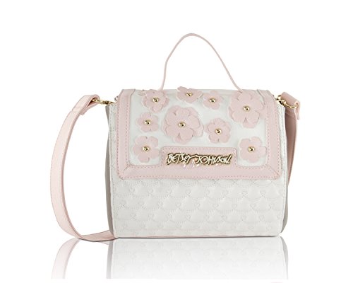 For the perfect blend of fashion and function, get the stylish Betsey Johnson Flap Day Crossbody Bag. Its constructed Cream swag quilted body, grey sides, blush trim with faux leather exterior, cream flap with 3-D flower and stud and gold-tone signature hardware, flapover closure opens to triple compartment purse, center compartment features wall zip pocket and 2 media pockets, detachable Cross-body strap with 23" shoulder drop offers security while wearing.Feature