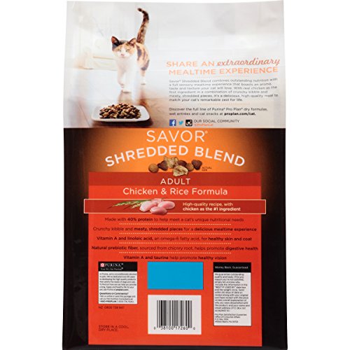- Feature : One (1) 3.2-Pound Bag of Purina Pro Plan Dry Cat Food, Savor, Shredded Blend Adult Chicken & Rice Formula / High-quality protein, including chicken as the #1 ingredient / Made with 40% protein, to help meet a cat's unique nutritional needs / Crunchy kibble and tender shredded pieces for a delicious mealtime experience. / Vitamin A and linoleic acid, an omega-6 fatty acid, for healthy skin and coat