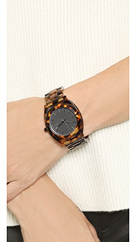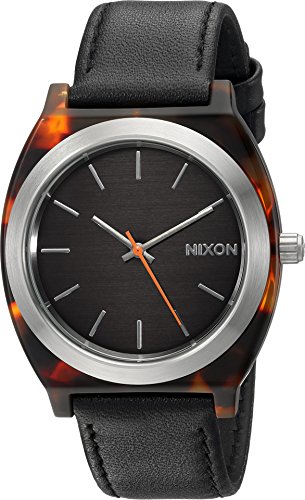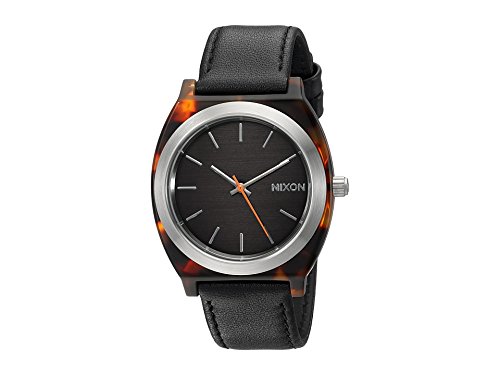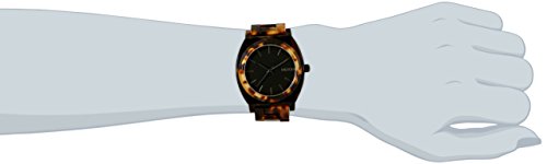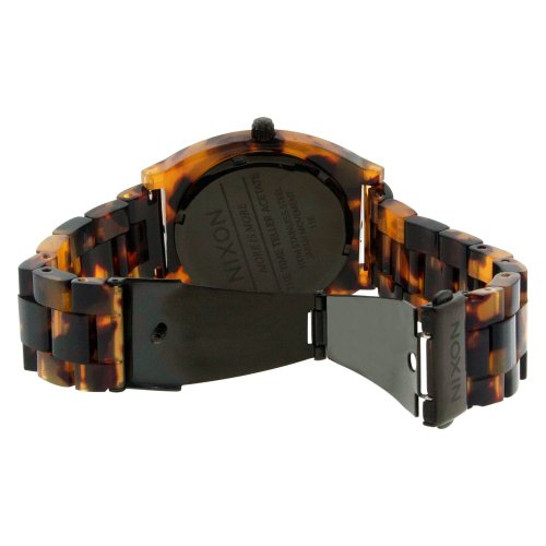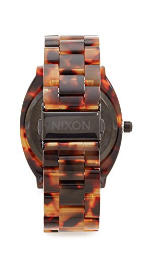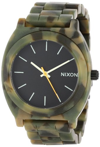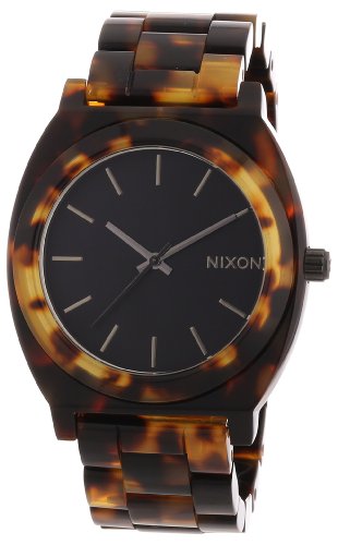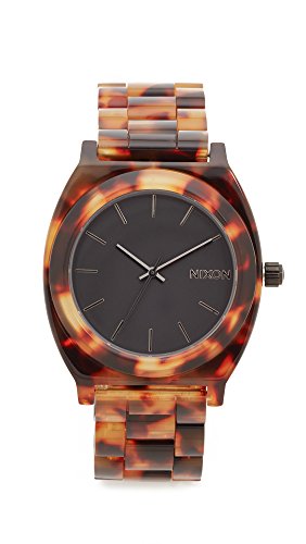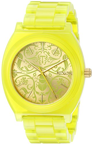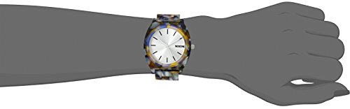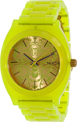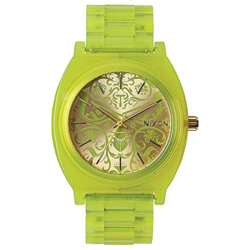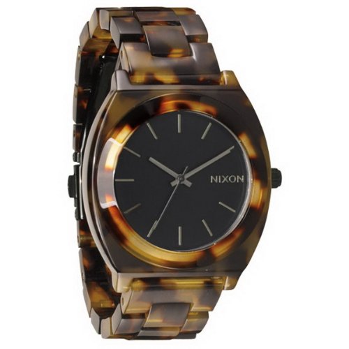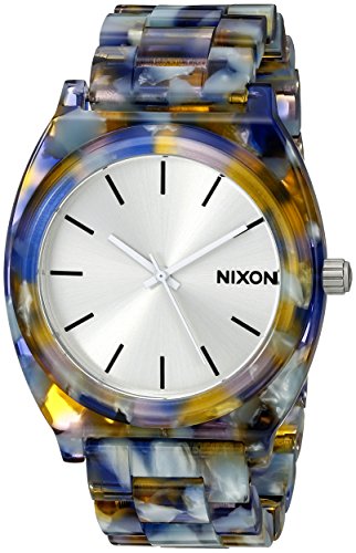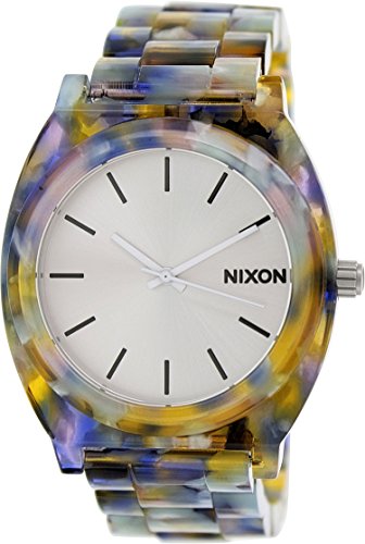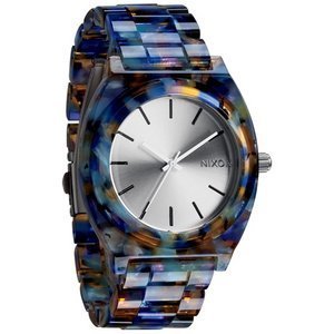Studio : Nixon Publisher : Nixon Binding : Watch Product Description You don't just know the time when you wear the Nixon Women's Time Teller Acetate Watch; you own time. Sliding on this acetate watch is sort of like grabbing Father Time by the beard and making him scrape the burnt part off your toast. The basic numberless three-hand face spews class and the smooth acetate band and housing provides a blank canvas for a number of colors and patterns that match your closet of clothing creations. If you find yourself on a beach trip, the 100-meter water-resistant case lets you take a dip without leaving your sweet timepiece within reach of beach bums.