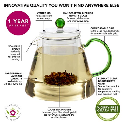 Product Description The replacement glass infuser for standard glass tea pots is made of laboratory quality borosilicate glass. Adaptable to most 34-40 oz size tea pots with diameters between 7.0 cm and 7.5 cm (2.75 inches and 2.95 inches). This high quality glass infuser is heat-resistant and dishwasher safe. 0