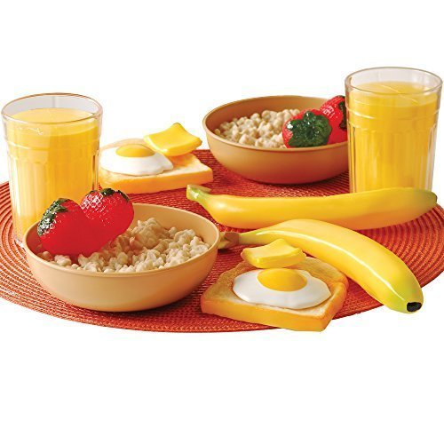 -. Feature : 16 pc. Set / Includes 2 eggs, 2 pieces of toast with butter, 2 bowls of oatmeal, 4 strawberries, 2 bananas with 2 plastic glasses of juice / Made of vinyl / Banana measures 8 1/2 inch / Ages 2 yrs. +