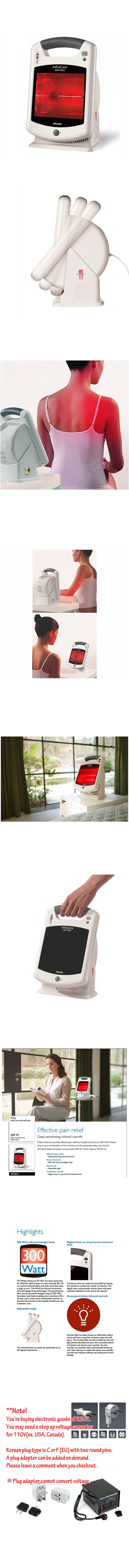Philips InfraCare Infrared Lamp HP3631/01 Rated Voltage : 220V, 50/60Hz (Europe/Asia "C", "F" plug type - Two round pins) * If your local AC power supply AC 100 ~ 120V, you will need a step up voltage transformer for Conversion. Power Consumption : 300 W / Treatment Area : 40 x 30 cm / Life of Lamp : 500 hours / Weight : 3.09 lbs (1.4 kg) / Dimensions : 20 x 30.9 x 17.2 cm / Battery : LR-54-Alkaline, 1.5V (Lifetime 200 actions) Effective pain relief ! Deep penetrating infrared warmth Philips InfraCare provides effective pain relief for muscles and joints. Its 300 Watt infrared lamp is very comfortable and the infrared warmth penetrates deep into the skin, stimulates blood circulation and provides relief for "zone" areas of 40x30 cm.
