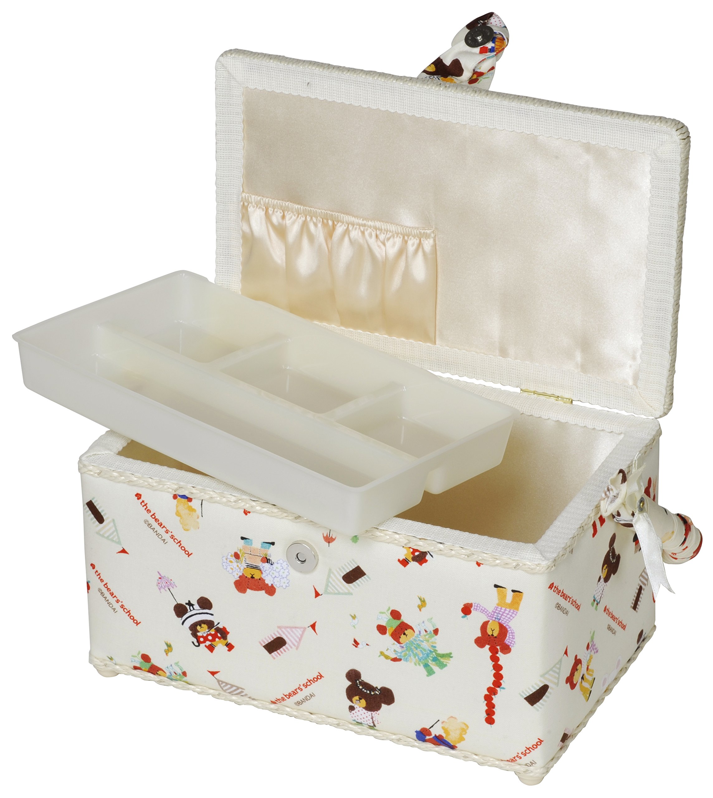 · A large basket with storage capacity is equipped with a tray that is perfect for storage of sewing supplies and accessories.