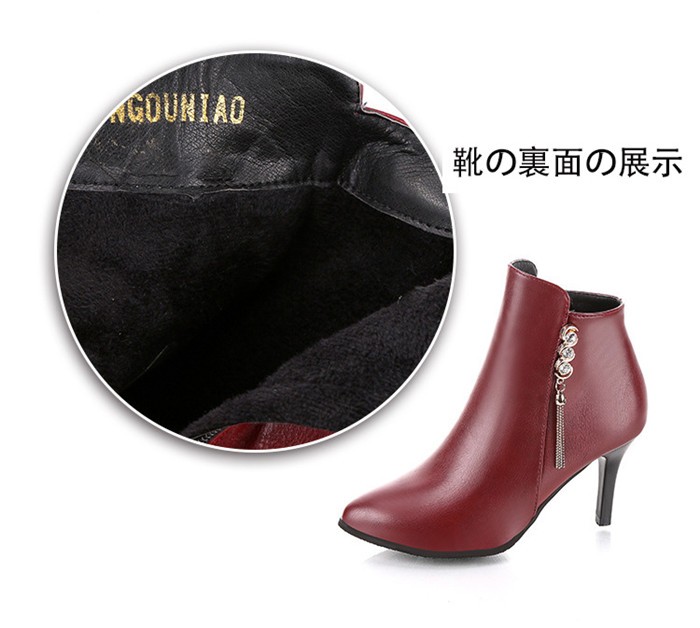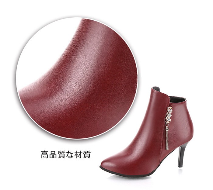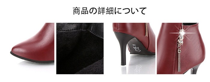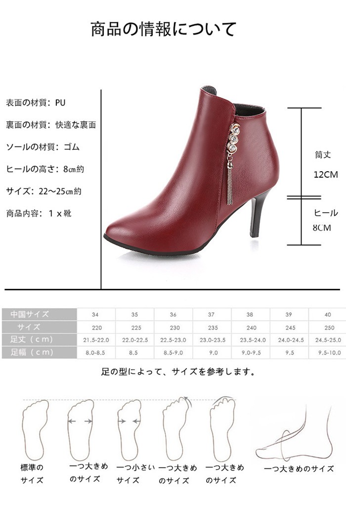 表面の材質:PU裏面の材質:快適な裏面ソールの材質:ゴムヒールの高さ:8cm約サイズ:22~25cm約商品内容:1*靴サイズ:34:22cm 35:22.5cm 36:23cm 37:23.5cm 38:24cm 39:24.5cm 40:25cmショートブーツレディース ヒール 女性のアンクルブーツ シューズ ファスナー式靴 秋冬物 シンプル くつレディース用のアンクルブーツが登場カラーもシルエットもとても組み合わせしやすくて、どんな場合にも使える上品な一足