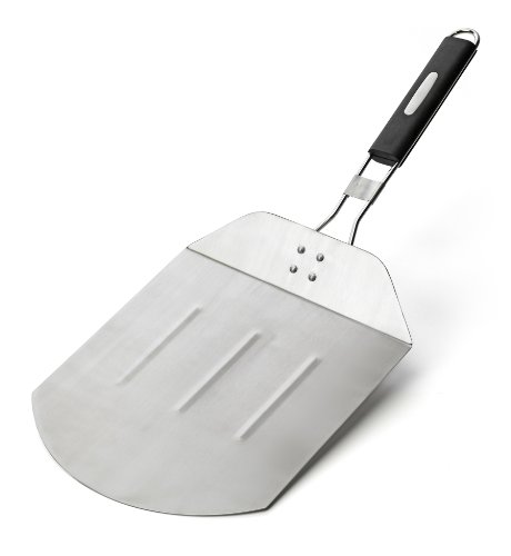 The pizza peel is another invaluable tool for grilling up home-cooked pizza. You can build your pizza on the peel, slide it off onto the pizza stone for cooking, turn or rotate it as needed, and finally remove your pizza when done. Our pizza peel has an ultra-thin stainless steel surface to make it as easy as possible to get under your cooking pizza and maneuver it as you need. It also features an aggressive back stop to keep the pizza secure and stable while in use, as well as a silicone folding handle for comfortable use and simple storage. The peel surface measures 9.5 by 10.5 inches, while the handle extends another 11 inches.