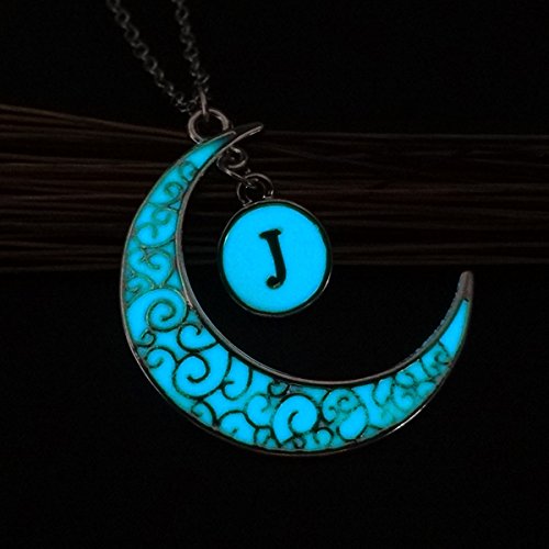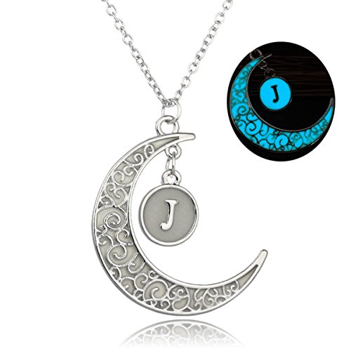 -. Title : Linsh Initial Necklace Glow in Dark Hollow Out Carved Moon J Letter Pendant Necklace Color: Silver