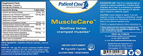 Patient One MuscleCareTM supplies three key electrolytes for maintaining healthy muscle contractile function, along with soothing botanical extracts of Valerian root, White willow bark and Passion flower to ease occasional muscle tension. This formula provides effective support to help reduce painful nighttime or excercise-related leg muscle cramps, minor muscle cramps associated with athletic activity, and overall muscle tension. NOTE: Looking for Physiologics MusclEase (90s)? Please note that this product has been discontinued, and that Patient One - MuscleCare (90s) has replaced it.Feature