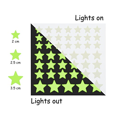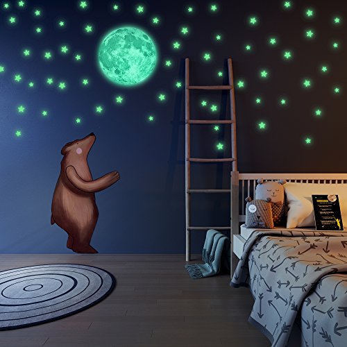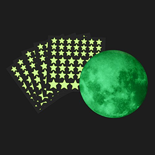 - BRING THE NIGHT SKY HOME - Create a realistic starry sky with this bright glowing stars with 3 different sizes and full moon, it adds the look of a real night sky. In the dark the room becomes to starry shiny bedroom like baby night light and In daylight the stars merge with white walls. Suit for any bedroom, college wall decor, for ceiling, boy girl room, lovely wall decoration.
