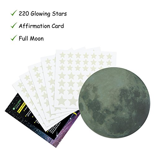 Glow in The Dark Stars and Moon Wall Stickers, Beautiful Wall Decals for Bedroom. Full Moon &220 adhesive Glowing Stars for Room, light your Ceiling, Bonus Affirmation Card for Kids By LIDERSTAR