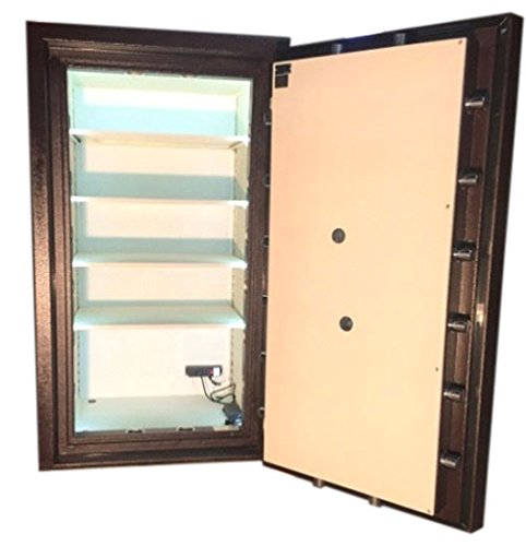 -. Feature : Impenetrable six-side protection / Four anchor bolt holes in bottom, Three interior electrical outlets / LED interior strip lighting, Mahogany exterior color with brass / Ivory faux leather interior upholstery, 4 fully adjustable shelves / 2 Sargent & Greenleaf (S&G) locks - one dial, one keypad