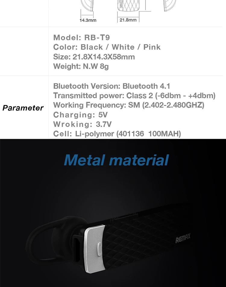 • 1 x REMAX RB-T9 Bluetooth Headset1 x USB Charging Cable1u0026nbsp;