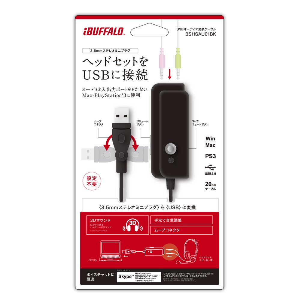 iBUFFALO USB audio cable (USB A to 3.5 mm stereo mini plug) black BSHSAU01BK stereo headset can be used in Mac PS3