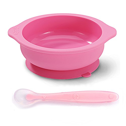Baby/Toddler Feeding Silicone bowl with Stay-Put Suction Base and Spoon Set (Pink)