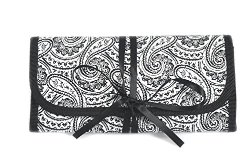 8" x 11" Hanging Travel Jewelry & Accessories Organizer Roll Bag (Black & White Paisley Print Exterior & Blue Interior)