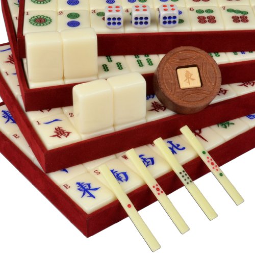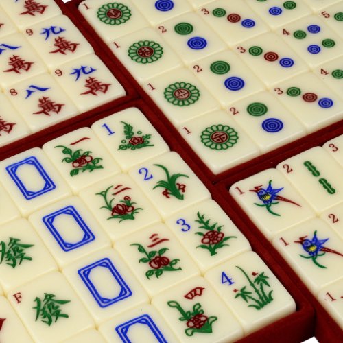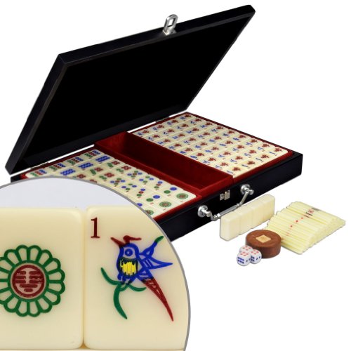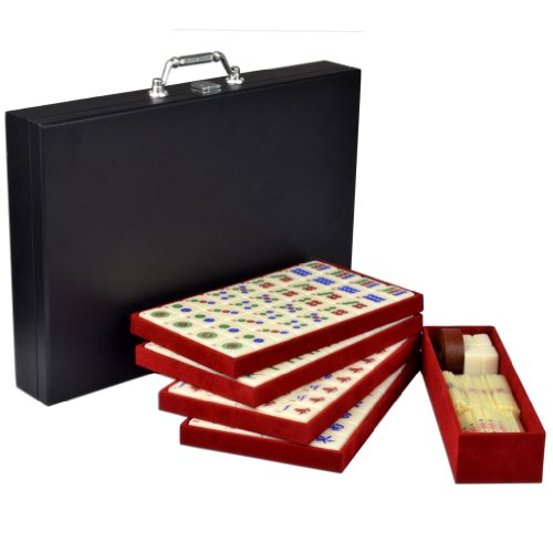 Elegant ivory white tiles paired with a sleek jet black wooden case make this a mahjong set that is handsome in its simplicity. Smart chrome latches and a royal red trays give it a professional, stylish look. The tiles are etched with vividly colored Chinese characters and Arabic numerals that are clear, precise, and easy to read. Unlike some of our larger sets, this mahjong set is relatively compact and easy to carry, so its perfect for travel or to bring to parties. However, the tiles are a comfortable large size that feel solid in your fingers. This is perhaps our most practical and versatile Chinese mahjong set.Feature