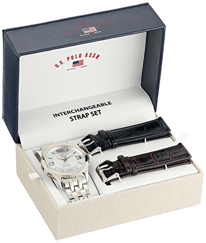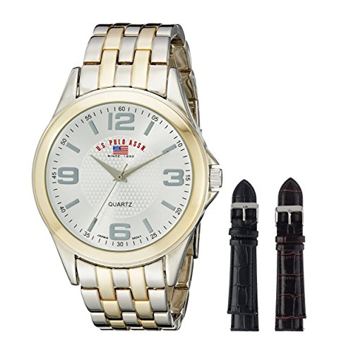 -. Binding : Watch -. Brand : U.S. Polo Assn. Classic -. Department : mens -. EAN : 0030506289449 -. Feature : Analog-quartz movement / Three pcs watch set (one bracelet watch; two interchangeable strap bands) / one strap band is black crocodile, another is brown crocodile / changing the band easily by pushing the pin / strap bands are with buckle closure -. Label : U.S. Polo Assn. Classic -. Manufacturer : U.S. Polo Assn. Classic -. Model : US2038 -. MPN : US2038 -. PartNumber : US2038 -. ProductGroup : Watch -. ProductTypeName : WATCH -. Publisher : U.S. Polo Assn. Classic -. Studio : U.S. Polo Assn. Classic -. Title : U.S. Polo Assn. Classic Men's US2038 Two-Tone Bracelet with Two Interchangeable Strap Bands Watch Set -. UPC : 030506289449