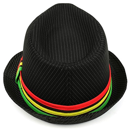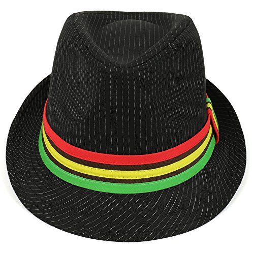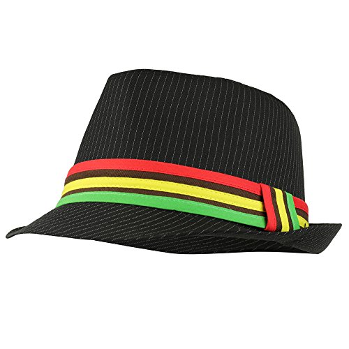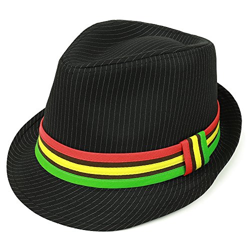 Binding : Apparel Product Description Our Trendy Apparel Shop Thin Pinstripe Cotton Fedora Hat with Rasta Colored Hat Band is a perfect hat for all the Rasta fans out there. This pinstriped fedora is accented with a Rasta colored hat band around the crown. Made of 100% Cotton. Crushed top crown. Upturned back brim. A rasta hat band around the crown. Fitted with an inner hatband. Fully lined inside. 2 different sizes available; S/M and L/XL 0