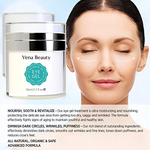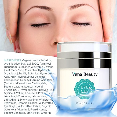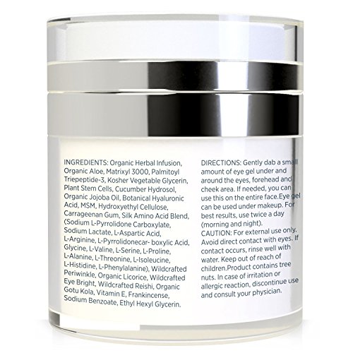 They say the eyes are the windows to the soul. Bring out your most beautiful eyes every day. Fight against the signs of aging with our powerful eye gel made with an all natural blend of super ingredients that effectively diminish dark circles,? wrinkles, puffiness, eye bags, fine lines, crow's feet, and sagginess around the eye area.? Directions: Gently dab a small amount of eye gel under and around the eyes, forehead and cheek area. If needed, you can use this on the entire face. Eye gel can be used under makeup. For best results, use twice a day (morning and night). CAUTION: For external use only. Avoid direct contact with eyes. If contact occurs, rinse well with water. Keep out of children. Product contains tree nuts. In case of irritation or allergic reaction, discontinue use and consult your physician, Ingredients: Organic Herbal Infusion, Organic Aloe, Matrixyl 3000, Palmitoyl Triepeptide-3, Kosher Vegetable Glycerin, Plant Stem Cells, Cucumber Hydrosol, Organic Jojoba Oil, Botanical Hyaluronic Acid, MSM, Hydroxyethyl Cellulose, Carrageenan Gum, Silk Amino Acid Blend, (Sodium L-Pyrrolidone Carboxylate, Sodium Lactate, L-Aspartic Acid, L-Arginine, L-Pyrrolidonecar- boxylic Acid, Glycine, L-Valine, L-Serine, L-Proline, L-Alanine, L-Threonine, L-Isoleucine, L-Histidine, L-Phenylalanine), Wildcrafted Periwinkle, Organic Licorice, Wildcrafted Eye Bright, Wildcrafted Reishi, Organic Gotu Kola, Vitamin E, Frankincense, Sodium Benzoate, Ethyl Hexyl Glycerin. 0 |