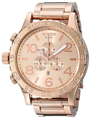 -. Binding : Watch -. Brand : NIXON -. Department : mens -. Feature : Brushed stainless steel watch featuring round dial with chronograph sub-dials, large Arabic numeral indices, and decorative hands / 51mm stainless steel case with mineral dial window / Japanese quartz movement with analog display / Three-link stainless steel band featuring fold-over clasp with Micro Adjust closure / Water resistant to 200 m (660 ft): In general, suitable for professional marine activity and serious surface water sports, but not scuba diving. -. Label : Nixon -. Manufacturer : Nixon -. Model : NIXON-A083-P -. MPN : NIXON-A083-P -. PartNumber : NIXON-A083-P -. ProductGroup : Watch -. ProductTypeName : WATCH -. Publisher : Nixon -. Studio : Nixon -. Title : Nixon Men's 51-30 Chronograph Stainless Steel Watch