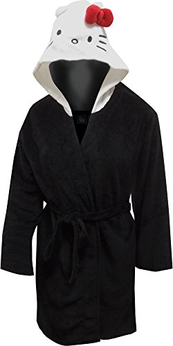 Get ready to snuggle into this adorable Hello Kitty robe for ladies! The robe itself is made with soft plush fabric in solid black. The hood is Hello Kitty's pretty face, complete with a plush red bow and ears! Robe has two pockets and an interior tie. Cozy up on cold nights with this fantastic robe!