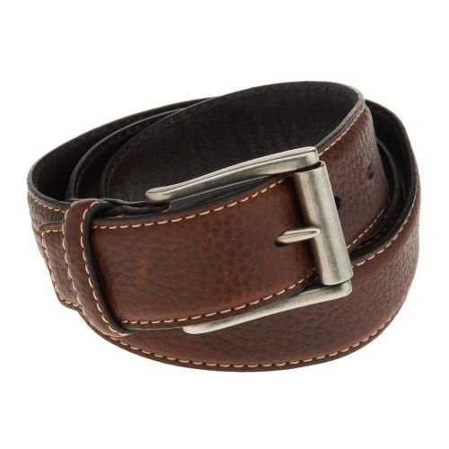 Leather belt featuring stitched edges and harness buckle with etched logo