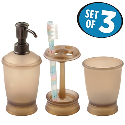 Soap Pump: Made of durable plastic with rust-proof, bronze finish plastic pump head; Toothbrush Holder: Made of durable plastic; Tumbler: Made of durable plastic