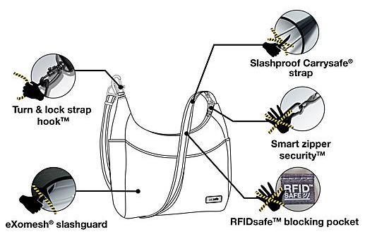 shoulder straps, interior mesh to deter pickpocketing, and RFID blocking to prevent hackers from stealing information