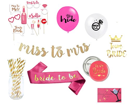 - AWESOME VALUE- This bachelorette favor set includes everything you will need for your bachelorette party! 12 balloons, 6 Team Bride badges and 6 team bride tattoo, 1 bride badge and tattoo, 1 quality sash, 12 straws, 32 scratch and dare cards, 1 Miss to Mrs. banner, and 10 photo props. Buy all at once and save money!