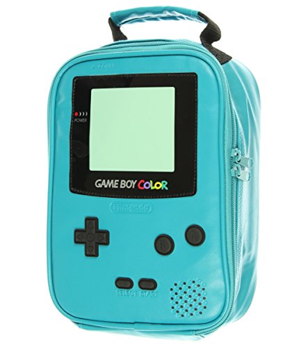 This insulated lunch box cooler bag from Nintendo features a Game Boy Color design with applique screen and rubber button details. It has a full zip closure and reinforced handle.