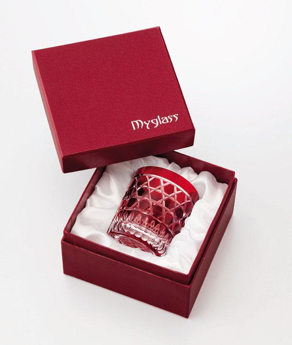 ギフトに最適な化粧箱に入った「色被切子」のマイグラス。