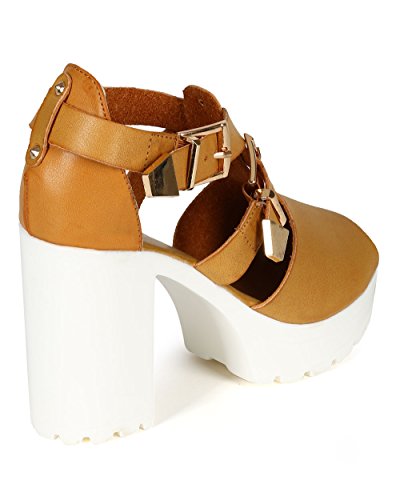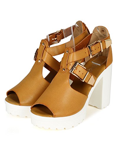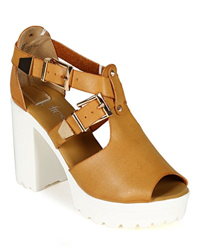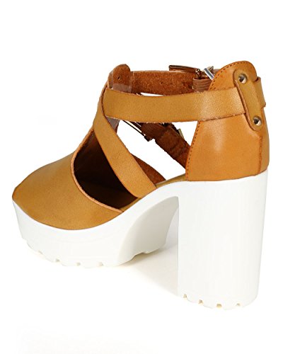 Refresh CD05 Women Leatherette Peep Toe Criss Cross Strap Platform Chunky Heel Sandal - Camel