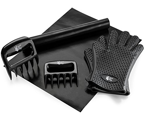 Professional Grade BBQ Mat, Gloves, & Claws | Grilling Accessories | Grill Glove, Mats & Meat Claw Sets | BBQ Gloves with 2 Barbecue Mats for Grills & 2 Pork Shredders | Easy-Clean Grilling Tools