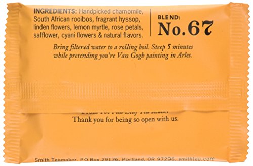 -. Binding : Health and Beauty -. Brand : Smith Teamaker -. EAN : 0853072002522 -. Feature : Caffeine free chamomile, rooibos, fragrant hyssop and rose petals -. IsAdultProduct : 0 -. Label : SMITH TEAMAKER -. LegalDisclaimer : Actual product packaging and materials may contain more and different information than what is shown on our website. We recommend that you do not rely solely on the information presented and that you always read labels, warnings, and directions before using or consuming a product -. Manufacturer : SMITH TEAMAKER -. MPN : 853072002522 -. PackageQuantity : 1 -. PartNumber : 853072002522 -. ProductGroup : Health and Beauty -. ProductTypeName : HEALTH_PERSONAL_CARE -. Publisher : SMITH TEAMAKER -. Studio : SMITH TEAMAKER -. Title : Smith Teamaker Herbal Tea - Meadow - 15 Bags pack of - 1 -. UPC : 853072002522