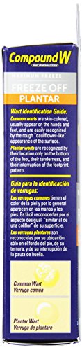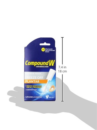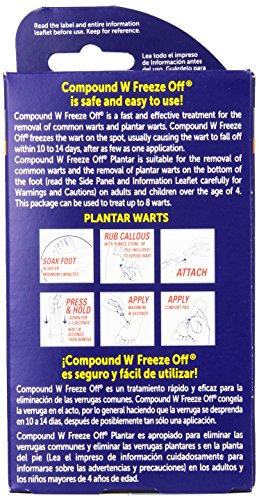-. Binding : Health and Beauty -. Brand : Compound W -. EAN : 0797978459168 -. Feature : Destroys Plantar Warts in a few as 1 treatment / Includes pumice file to expose wart and comfort pads to cushion and protect feet / There is no faster or easier over-the-counter wart remover treatment / The same method used by doctors, #1 Pharmacist recommended brand / Safe to use on kids ages four & older -. HazardousMaterialType : Unknown -. IsAdultProduct : 0 -. Label : Compound W -. LegalDisclaimer : Actual product packaging and materials may contain more and/or different information than that shown on our Web site. We recommend that you do not solely rely on the information presented and that you always read labels, warnings, and directions before using or consuming a product. Content on this site is for reference purposes and is not intended to substitute for advice given by a physician, pharmacist, or other licensed health-care professional. You should not use this information as self-diagnosis or for treating a health problem or disease. Contact your health-care provider immediately if you suspect that you have a medical problem. Information and statements regarding dietary supplements have not been evaluated by the Food and Drug Administration and are not intended to diagnose, treat, cure, or prevent any disease or health condition. ABC Wholesale assumes no liability for inaccuracies or misstatements about products. -. Manufacturer : Compound W -. Model : hbf-jjj-omgh-mh4824 -. MPN : 10075137440347 -. NumberOfItems : 1 -. PackageQuantity : 1 -. PartNumber : 10075137440347 -. ProductGroup : Health and Beauty -. ProductTypeName : HEALTH_PERSONAL_CARE -. Publisher : Compound W -. Studio : Compound W -. Title : Compound W Freeze Off Plantar 8 applications kit -. UPC : 885310381441