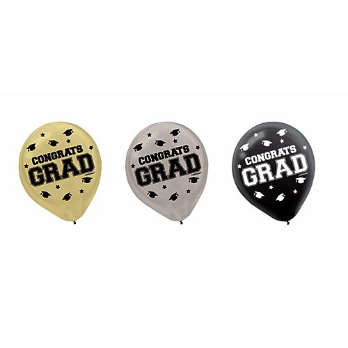 These Congrats Grad Latex Balloons will surely add life to your graduation party! Each package contains 72 - 12 inch Congrats Grad latex balloons in a three colors: black, silver and gold. Attach to the backs of chairs or create wonderful balloon bouquets and centerpieces by adding a coordinating mylar balloon, curling ribbon and balloon weight.