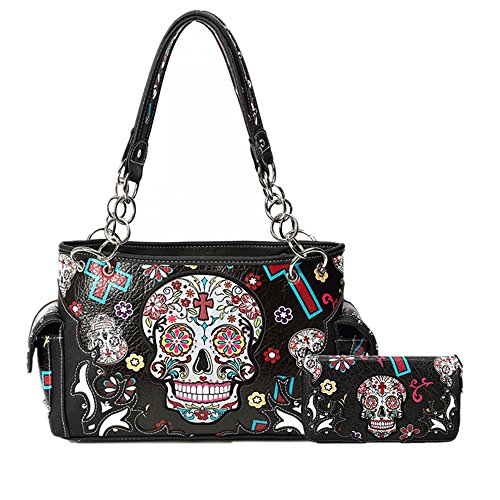 Product Description High quality polyurethane leather matching Calavera Sugar Skull Purse and Wallet Set. Designer-inspired. Lots of space, including a rear exterior zip pocket that can be used for easy access to a concealed-carry, or just for extra storage. 0