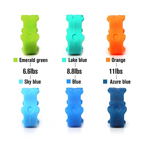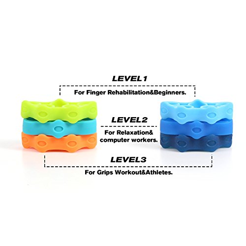 3 DIFFERENT RESISTANCE LEVELS 6 DIFFERENT COLORS : Level 1(6.6LB):Apple GreenLight Blue:For Finger RehabilitationBeginners. Level 2(8.8LB):Sky BlueBlue:For Relaxationcomputer workers. Level 3(11LB): OrangeDark Blue:For Grips WorkoutAthletes.