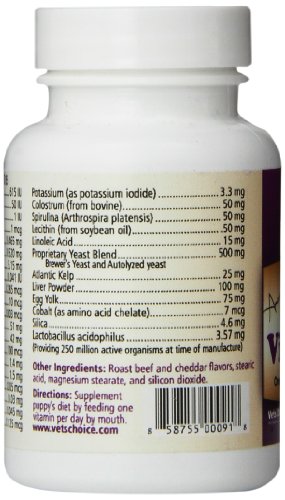 Chewable vitamin and mineral tablets for growing puppies. Contains essential fatty acide and protiens. Intended as a dietry suppliment to help prevent and treat vitamin and mineral deficiencies.Feature