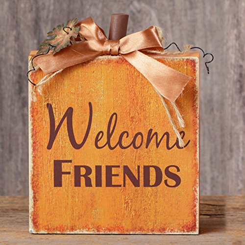 Welcome Friends Thanksgiving Pumpkin 5 x 8 Inch Wood Tabletop Block Sign