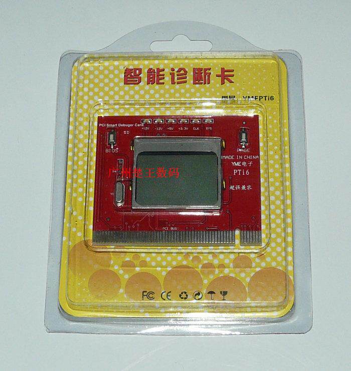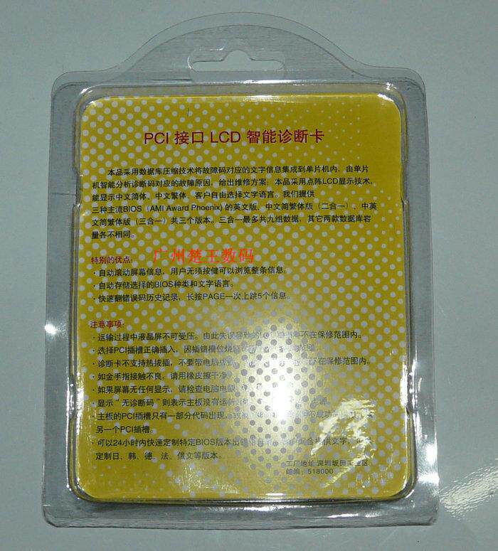 第二工作原理:主板BIOS在每次开机时,对系统的电路、存储器、键盘、视频部分、硬盘、软驱等各个组件进行严格测试,并分析硬盘系统配置,对已配置的基本I/O设置进行初始化,一切正常后,再引导操作系统。这里都每一步,BIOS都会向PCI的监听地址(80H或者其它)输出对应的诊断码(POST CODE)。将?吨形?诊断卡插入PCI槽内,然后上电开机,中文诊断卡直接显示诊断码(POST CODE)和对应试故障原因,并且在液晶屏幕上显示相应的维修指导(PIi6特别升级)。