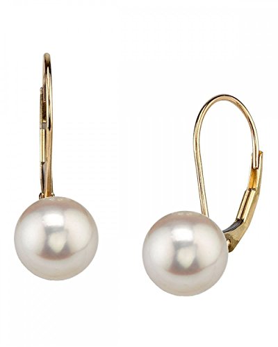 -. Title : 14K Gold Round White Akoya High Luster Cultured Pearl Leverback Earrings - AAA Quality