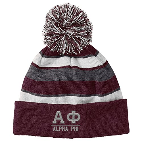 Product DescriptionAlpha Phi Greek Comeback Beanie Warm and soft 100% acrylic rib knit Tri-color pom-pom detail on top Folded hem Fit type: One size0