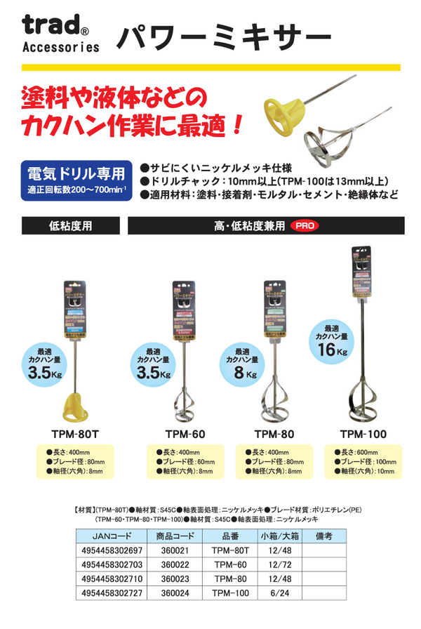 ●適用材料:塗料・接着剤・モルタル・セメント・絶縁体など 電気ドリル専用 適正回転数200~700min