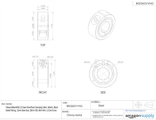 Climax Metal M1C-12 Steel One-Piece Clamping Collar, Metric, Black Oxide Plating, 12mm Bore Size, 28mm OD, With M4 x 12 Set Screw